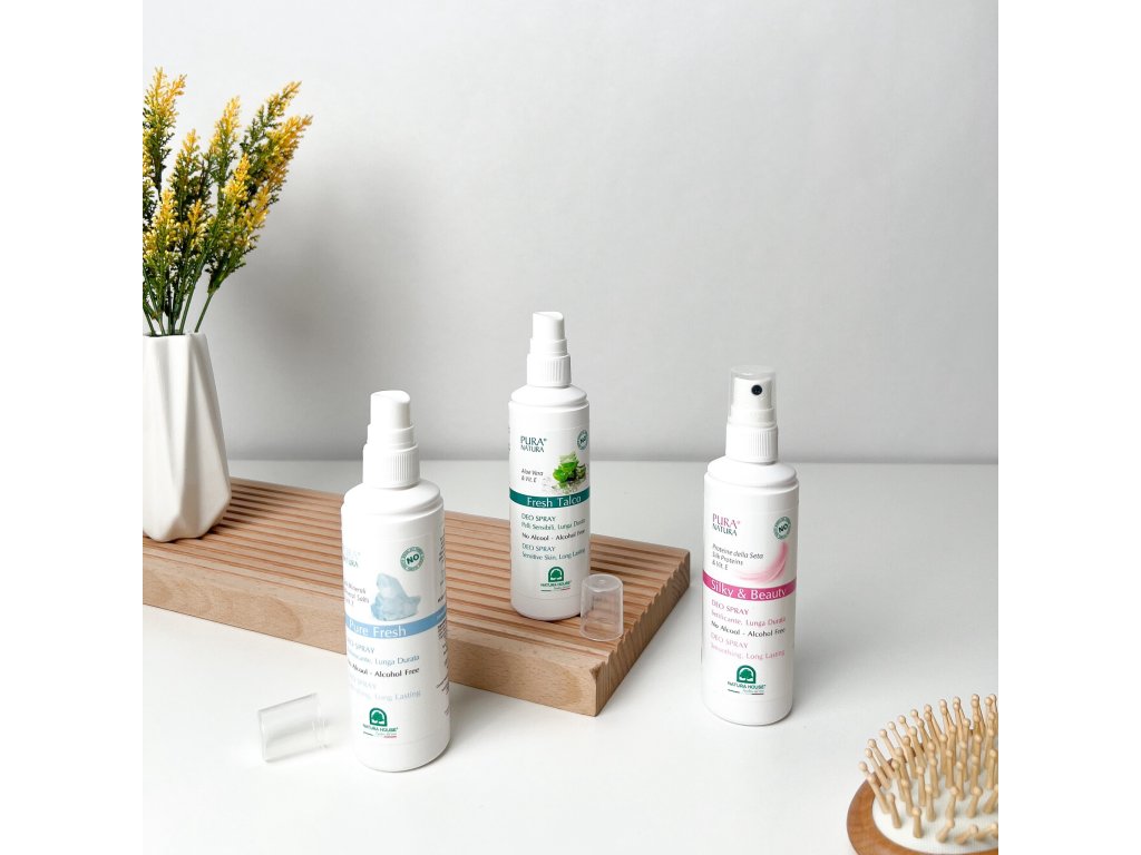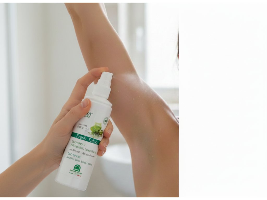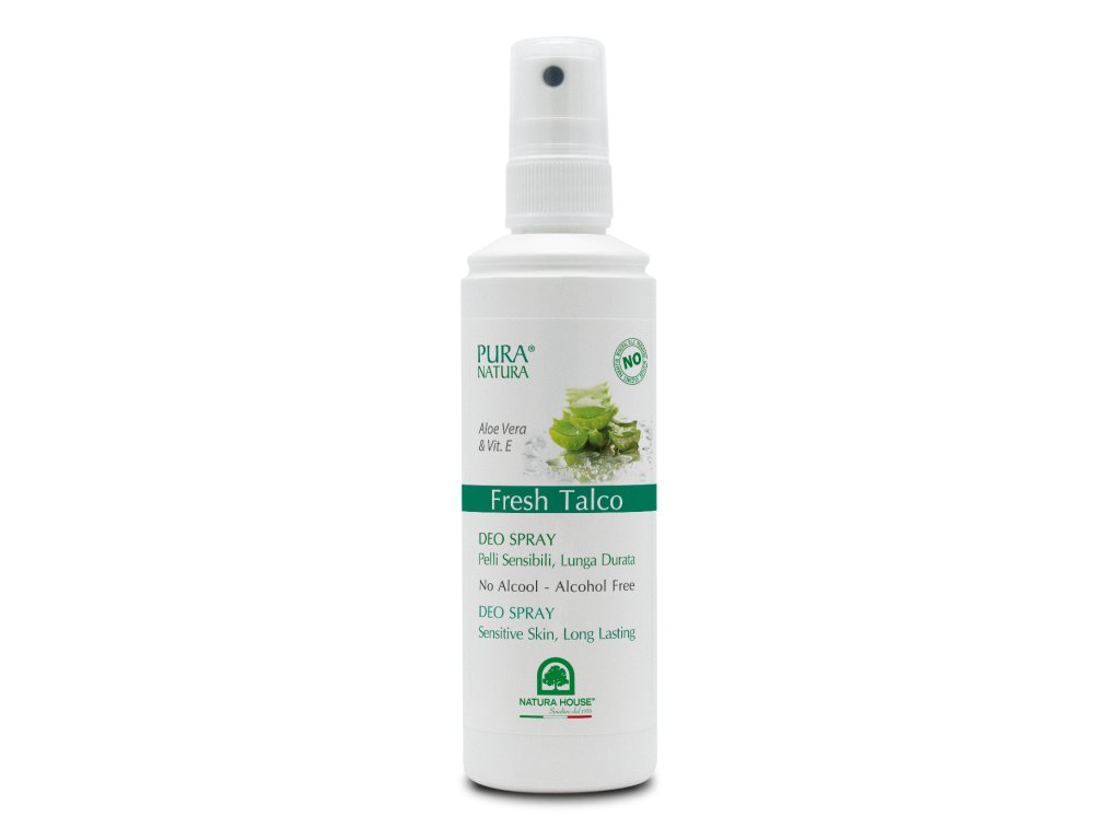 FRESH TALCO Deodorant SPREJ jemný a svieži prírodný deodorant, bez obsahu hliníkových (alumíniových) solí, s Aloe vera a vitamínom E. Jemná, osviežujúca vôňa dodáva pocit čistoty a sviežosti po celý deň, poteší aj tie najcitlivejšie nosy a neprebije váš obľúbený parfém. Šetrné prírodné zloženie neupcháva póry, takže sa telo stále môže pomocou potenia zbaviť odpadových látok z organizmu. Antibakteriálna sila aktívneho komplexu proti zápachu účinne ničí baktérie, ktoré potom nemajú šancu tvoriť nepríjemný odér. Deodorant kombinuje účinnosť proti zápachu s hydratačnými, upokojujúcimi a ochrannými vlastnosťami. Vďaka aktívnym zložkám prírodného pôvodu aj tá najcitlivejšia pokožke v podpazuší je v bezpečí. Sprej deodorantu je vďaka inovatívnej technológii poháňaný iba tlakom vzduchu a nie chemickými zložkami, ide tak o plne bezpečnú voľbu nespôsobujúcu podráždenie pokožky.